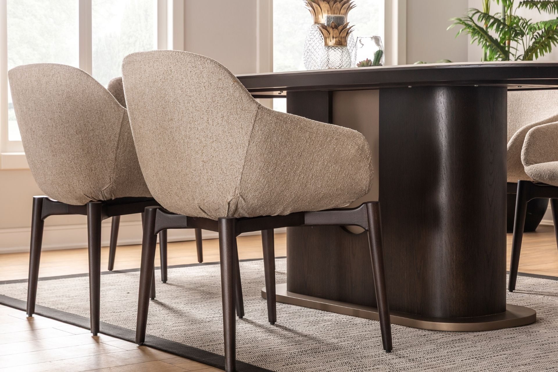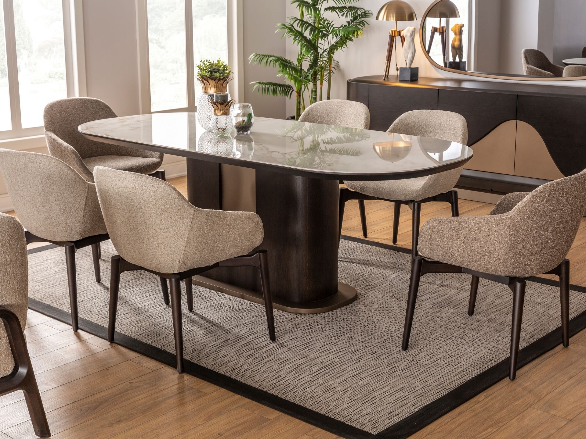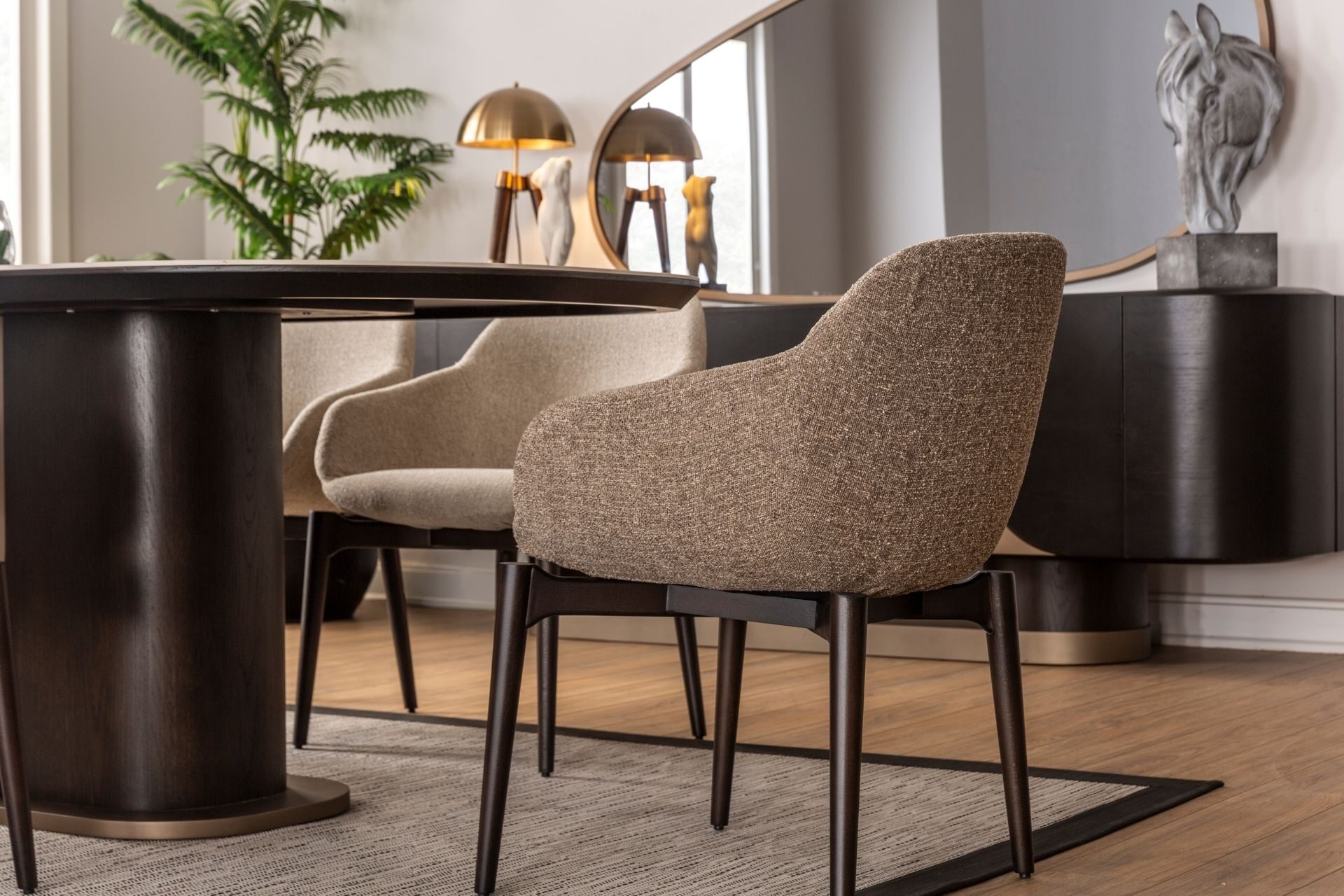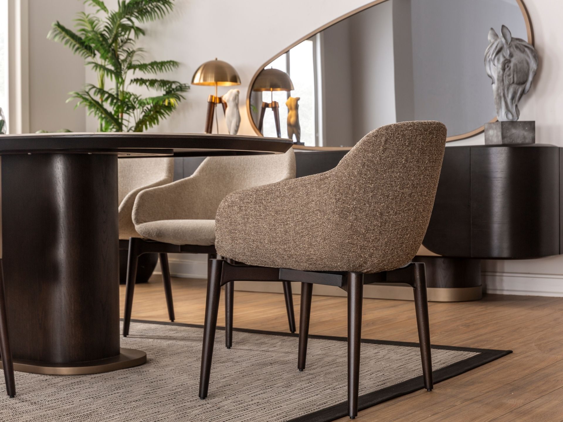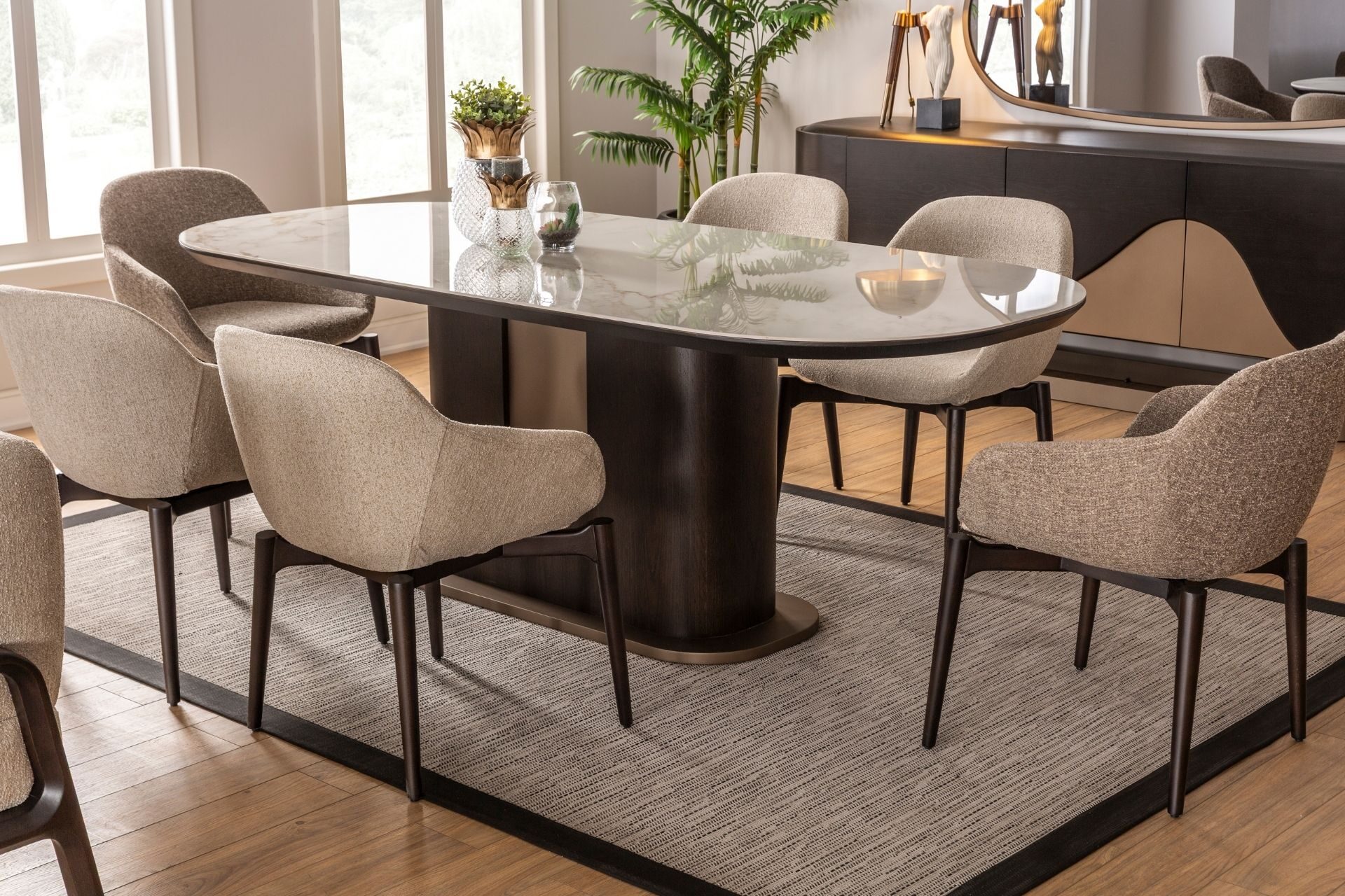 Estetik duruşun fonksiyonel bir dehayla buluştuğu nokta: Luna Yemek Odası. Geniş iç hacimli konsolu, sessiz yavaşlatıcı mekanizmalı kapakları ve ergonomik sandalye yapısıyla hayatınızı kolaylaştırırken şıklığından asla ödün vermiyor. Yüksek zanaatkarlık ürünü olan yüzey işçiliği ve zemine ferahlık katan zarif ayak yapısı, uzun ömürlü bir kullanım vaat ediyor. Luna ile en kalabalık davetleriniz bile kusursuz bir düzen ve asalet içinde geçiyor.