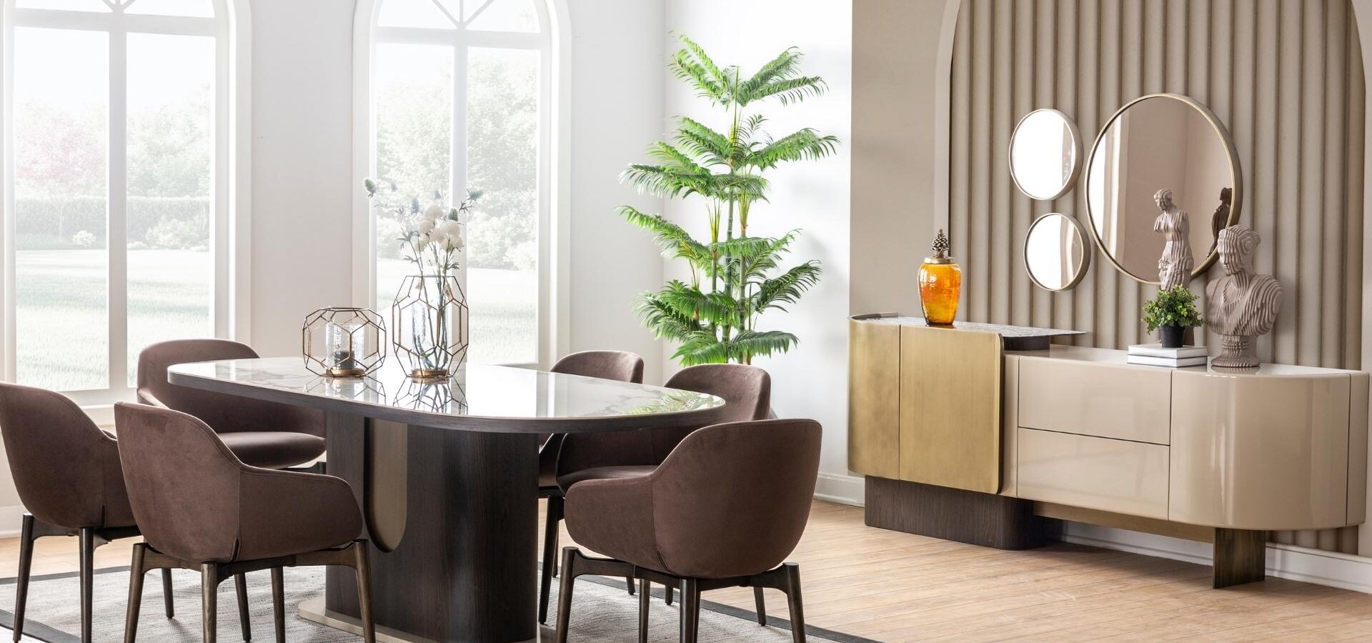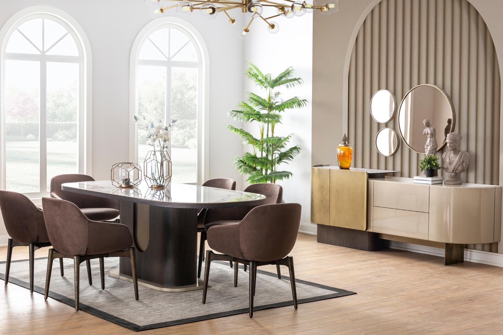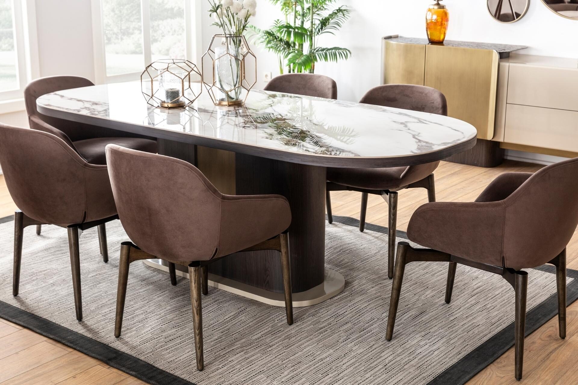 Zanaatkarlığın modern lüksle buluştuğu nokta. Diana Sandalye, koleksiyona özel metalik aksanları ve karakteristik dikiş detaylarıyla sadece bir sandalye değil, yemek odanızın stilini belirleyen bir tasarım objesi niteliğinde. Yüksek kaliteli döşemesi ve sağlam iskelet yapısı, uzun yıllar boyunca ilk günkü şıklığını ve formunu koruması için tasarlandı. Diana serisinin o asil ve ışıltılı ruhunu her dokunuşta hissettirir.